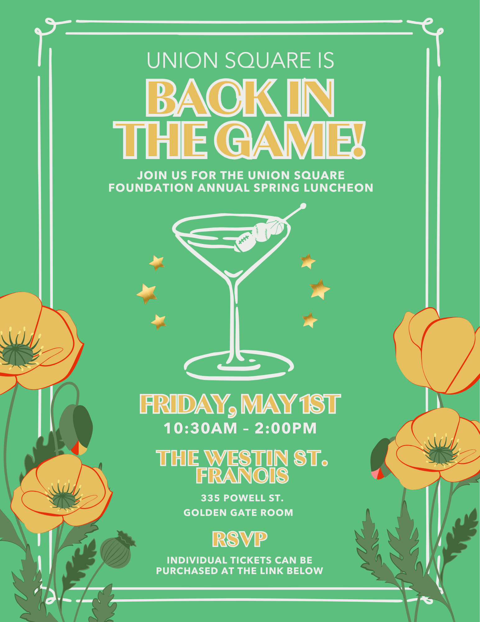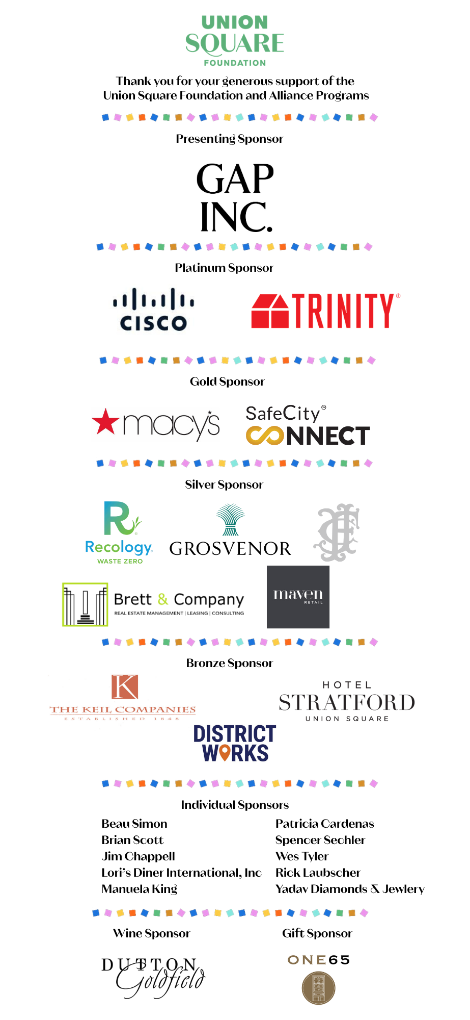 All proceeds of this event will support Union Square Foundation projects and programs including Union Square in Bloom, Winter Walk, Maiden Lane beautification and activations, Lighting Projects around the district and Powell Street Promenade landscaping and maintenance.